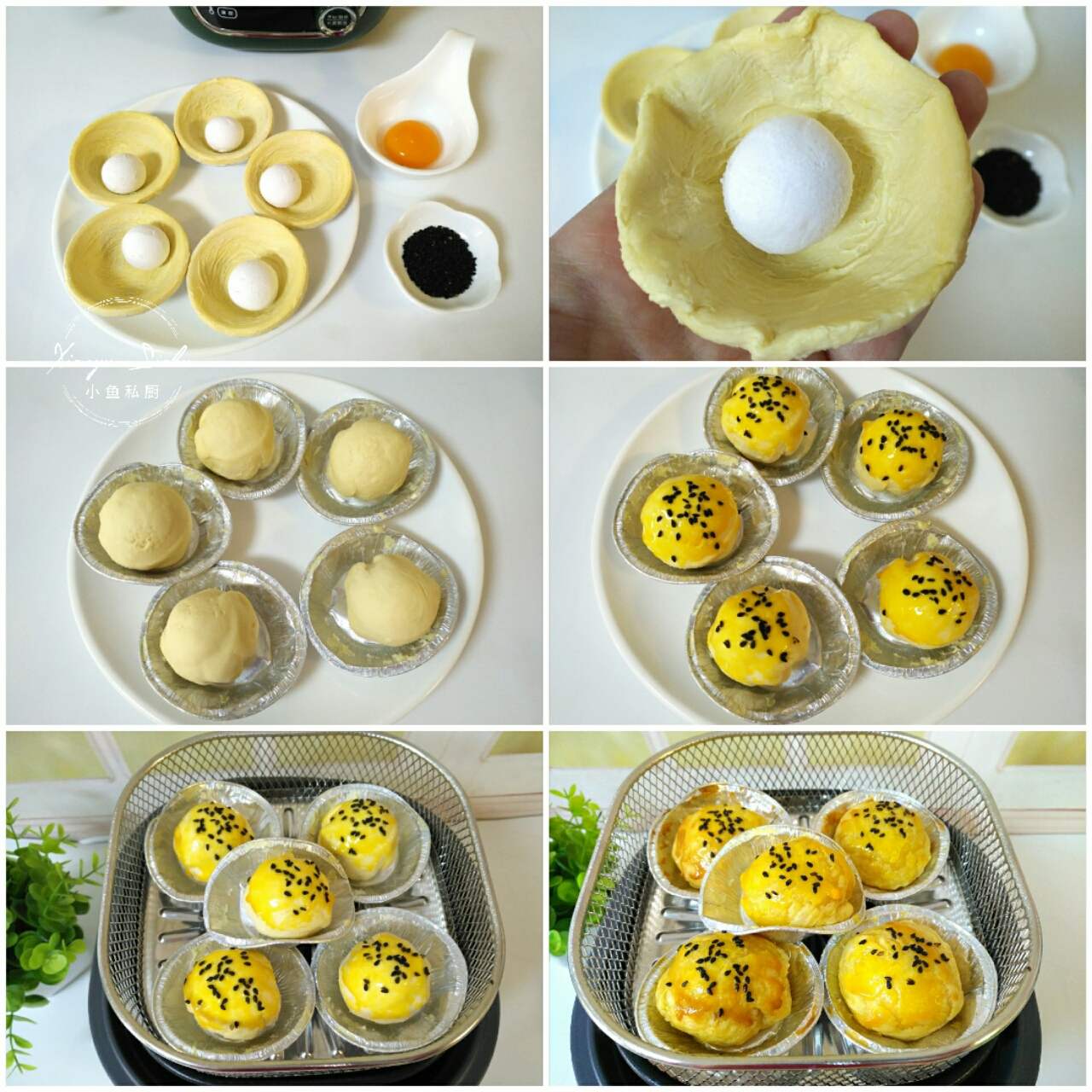 1,蛋撻皮解凍軟化後,包入黑芝麻湯圓,收口朝下放入蛋撻碗中。刷上一層蛋黃液,撒上黑芝麻。